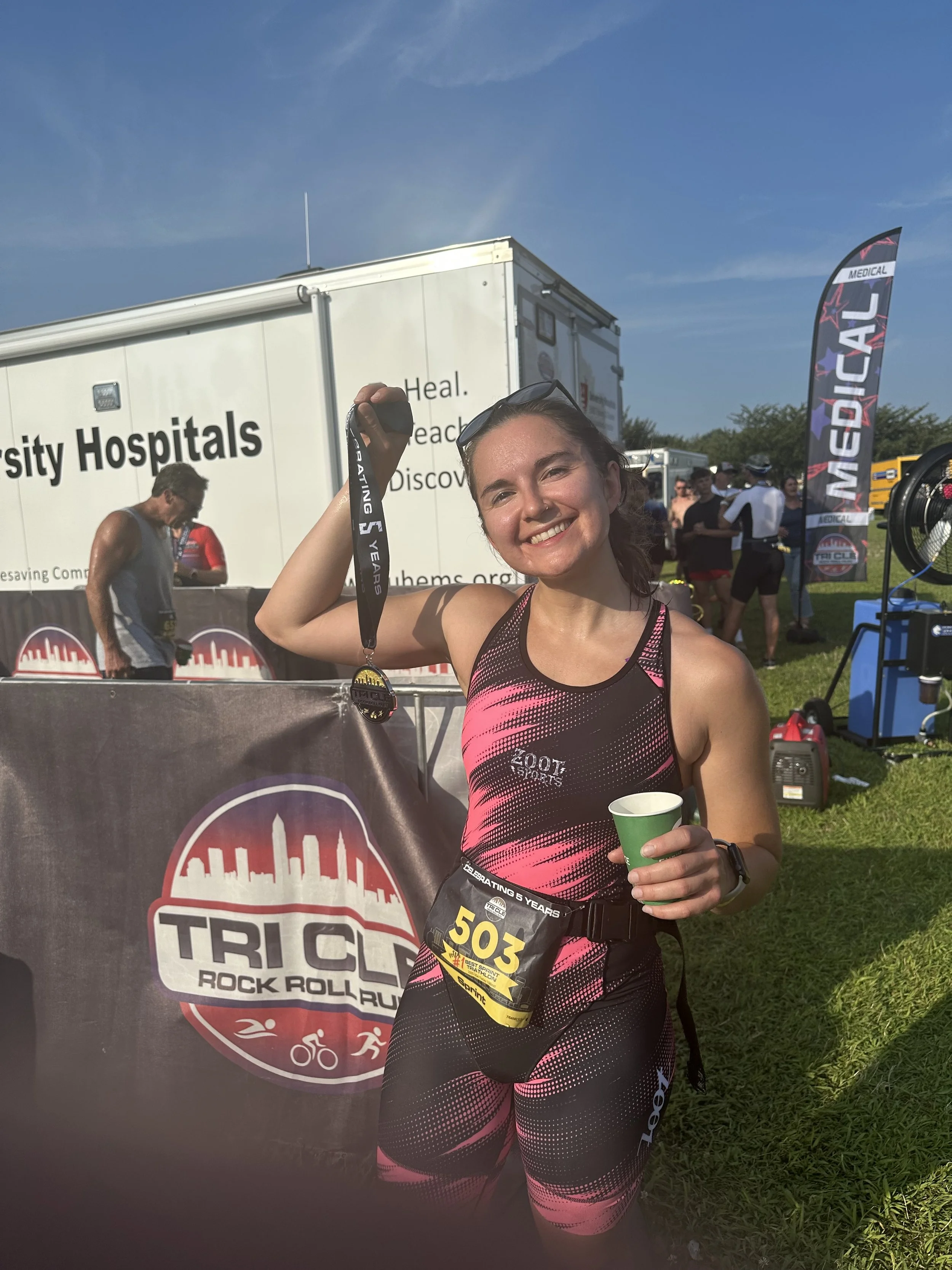 Outside of work, you can find my exploring Cleveland’s food scene, dabbling in triathlon (pictured!), walking our dog in Lakewood Park, or cozied up with a good book.